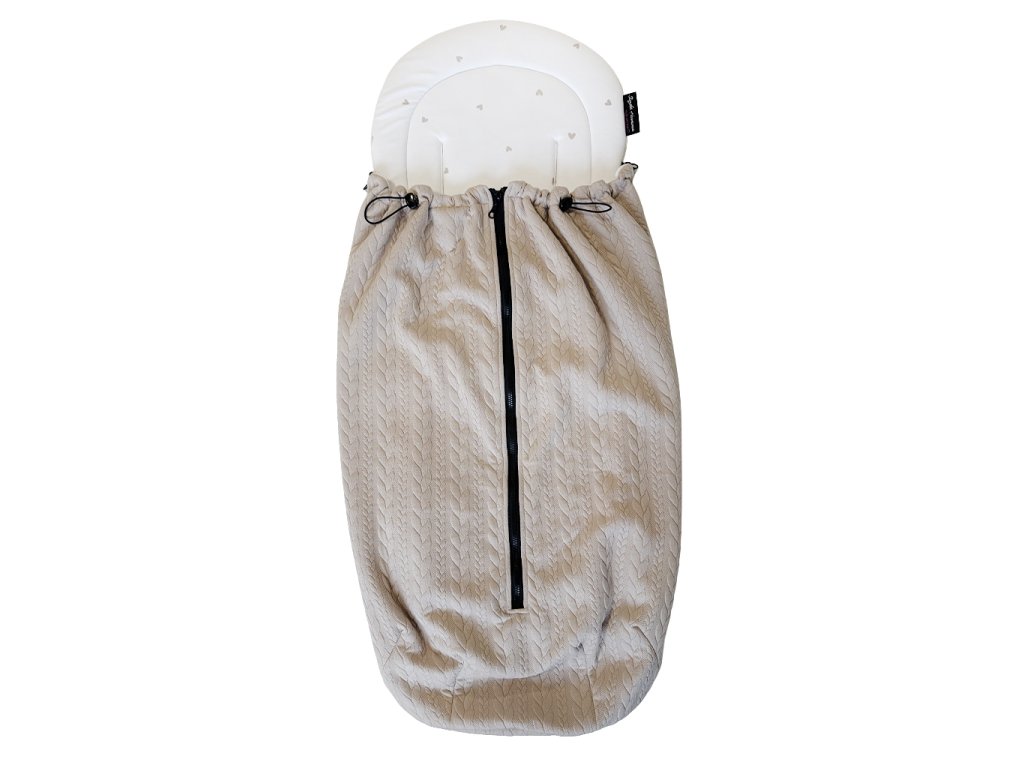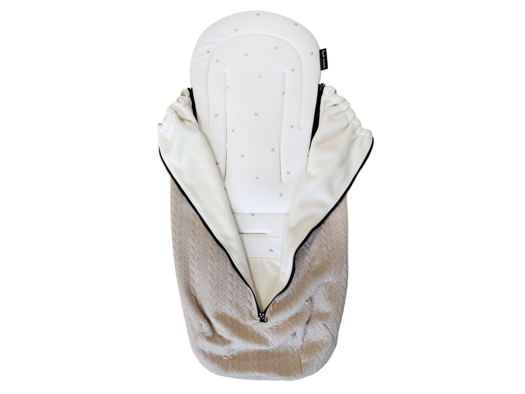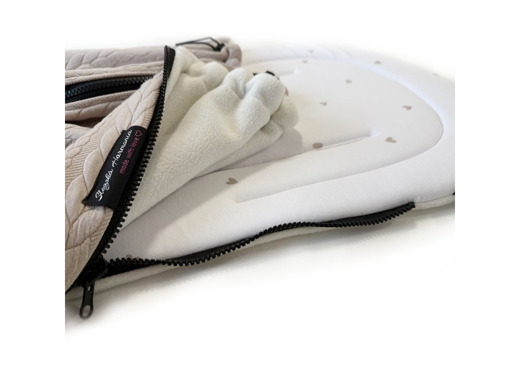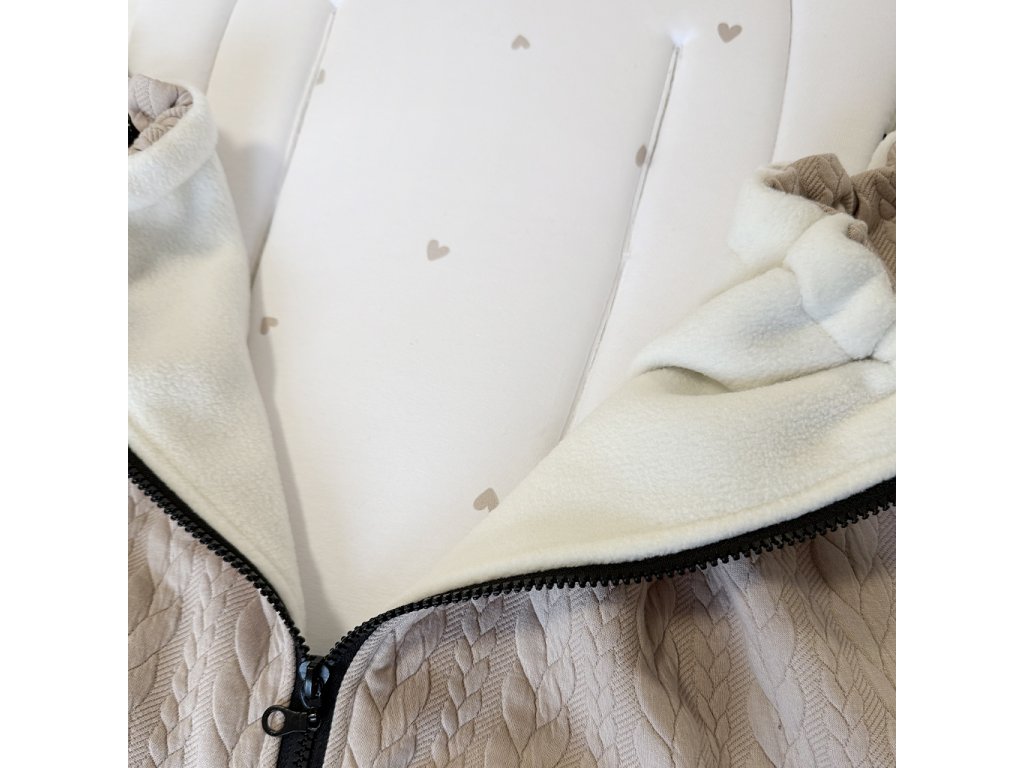 ✔️Chytrý střih a stylové provedení – podložku pro miminko do kočárku lze používat samostatně, je oboustranná a díky postranním zipům lze kdykoliv připevnit nepadací kočárkovou deku. Vnější strana deky je z copánkového úpletu, vnitřní strana je z hebkého fleece. Ve spodní části podložky je nepromokavá a omyvatelná šusťákovinová část na nožičky. Kombinace béžové a malých srdíček působí nadčasově, ale zároveň i jemně dětsky.
