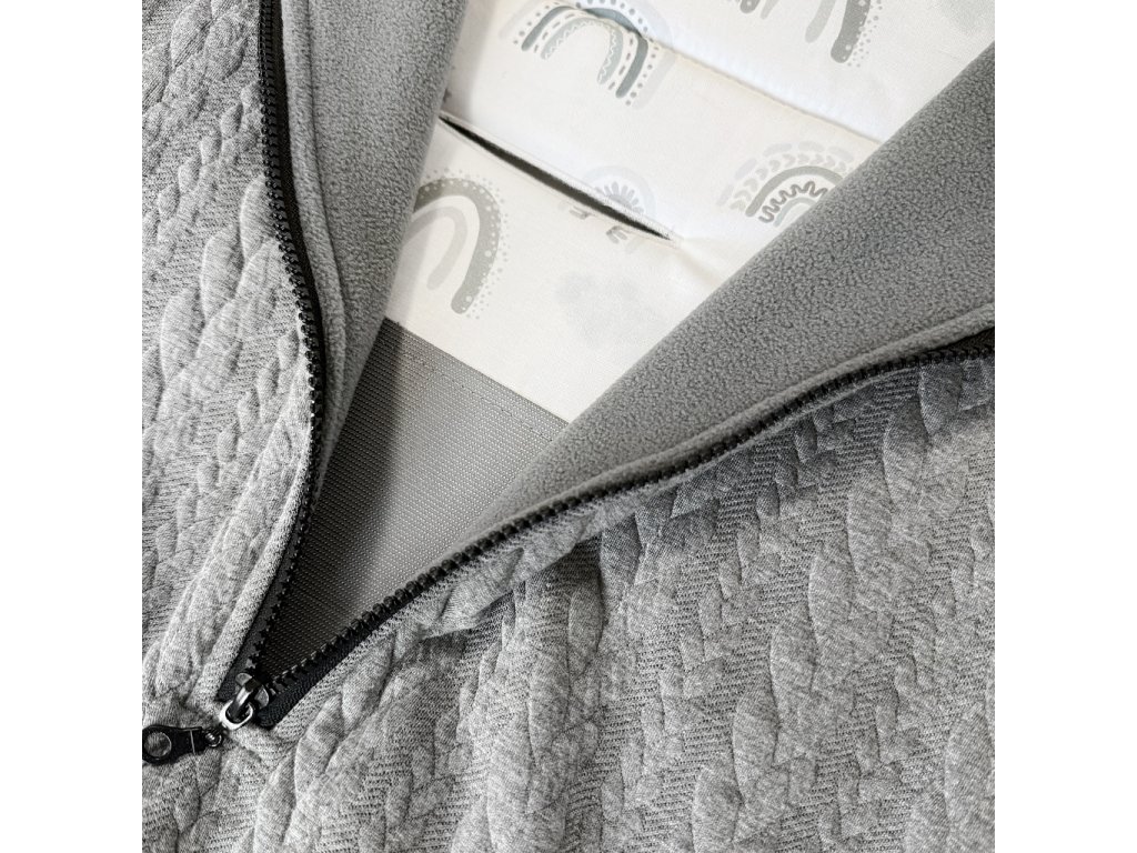 - Barva: šedý copánkový úplet v kombinaci s jednobarevným fleecem a šedivými duhami na bílém podkladu